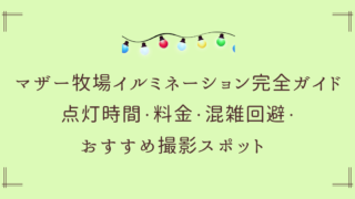 楽しみ方&体験 【2025年最新】マザー牧場イルミネーション完全ガイド|点灯時間・料金・混雑回避・おすすめ撮影スポット 冬のマザー牧場といえば、やっぱり「イルミネーション」澄んだ空気の中、広大な牧場が光に包まれる幻想的な景色は、子どもから大人まで幅広い世代に愛されています。今年も最新情報をもとに、開催期間・点灯時間・料金・混雑回避のコツ・おすすめ撮影スポット... 楽しみ方&体験